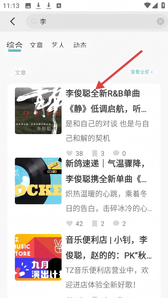 3、在应用中搜索【李】,可找到艺人李俊聪的相关文章。