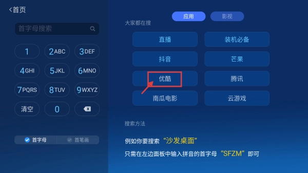 2、在搜索页面,点击优酷选项,查看相关应用列表。