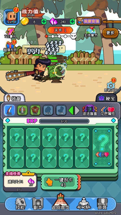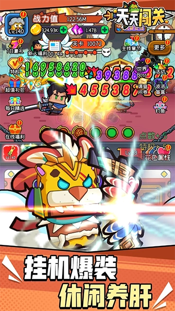 1、天天闯关作为一款放置类游戏,装备的核心获取途径是刮刮乐玩法,装备自身的属性由刮刮乐的中奖属性随机生成,这与市面上同类产品有着显著区别。玩家能凭借极品、神品装备的强力属性实现逆袭,快速通关!