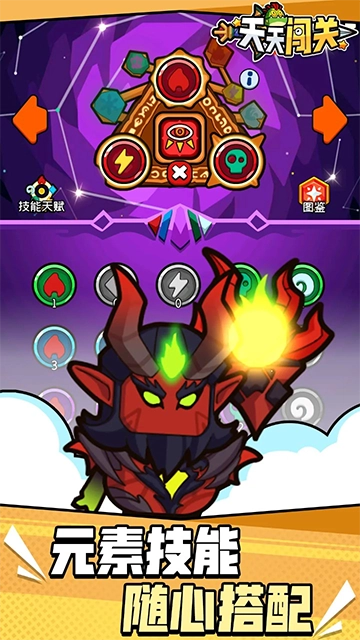 3、技能通过元素合成获取,你可以自由挑选心仪的技能,无论是被动技能还是主动技能,亦或是火系、冰系等不同属性的技能,都能随心搭配。搭配装备属性后,还能触发意想不到的效果,比如超强防御、极致攻速、超高攻击等,快来一较高下,看看谁才是百搭策略之王!