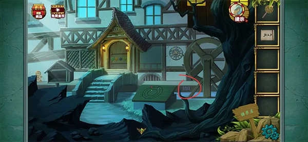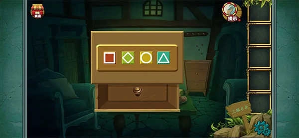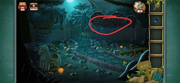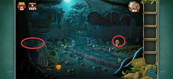 拼成这样就差不多了 完成后得到一把刀然后记住下方的糖果提示 之后会用到(小伙伴玩这种游戏的时候看到可疑的提示都可以注意下 后面都会用的到的 ) 然后点击台子上方的水井 可以看到一个颜色提示记下来 然后拾取水桶