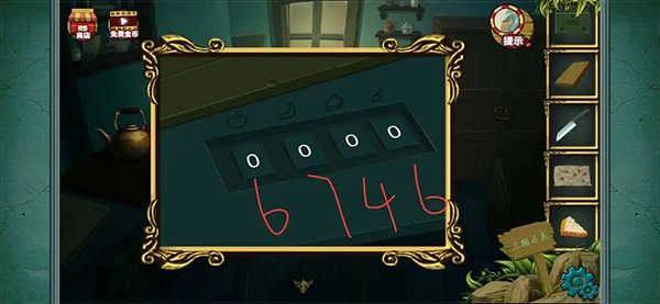 然后点击左下角可以看到一个上有着水果提示的密码锁 根据我们之前得到的线索得知密码为6746