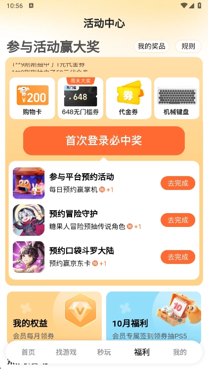 2、然后点击上方的福利页面,每个月都是能够免费领取福利的哦
