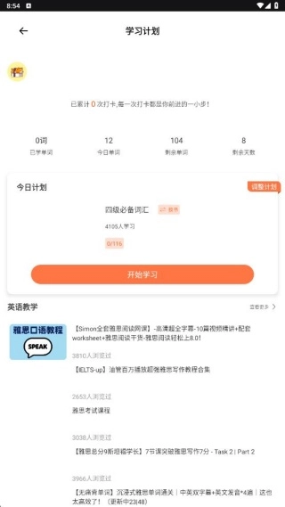 2、每个人可以按照个人安排,在今日计划板块完成设置开始背单词。
