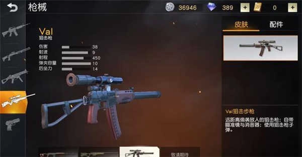 val狙击枪自带消声器和四倍镜,前期没有其他狙击枪的情况下val简直就是一把利器!毕竟在如果步枪没有倍镜的时候,这把枪的特色就展示出来了!
