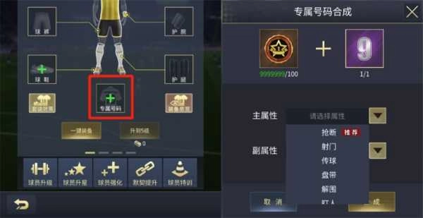 当我们看到号码时就会联想起他们在球场上的身影,现在你也可以为你手下的球员们选择专属号码了!在装备界面点击人物下方的方框就可以对号码进行设定,专属号码除了需要你心仪的号码道具,还需要专属证明来进行合成,并且可以选择适合自己的属性。这些合成材料都需要你从接下来介绍的巅峰对决玩法中获取哦~