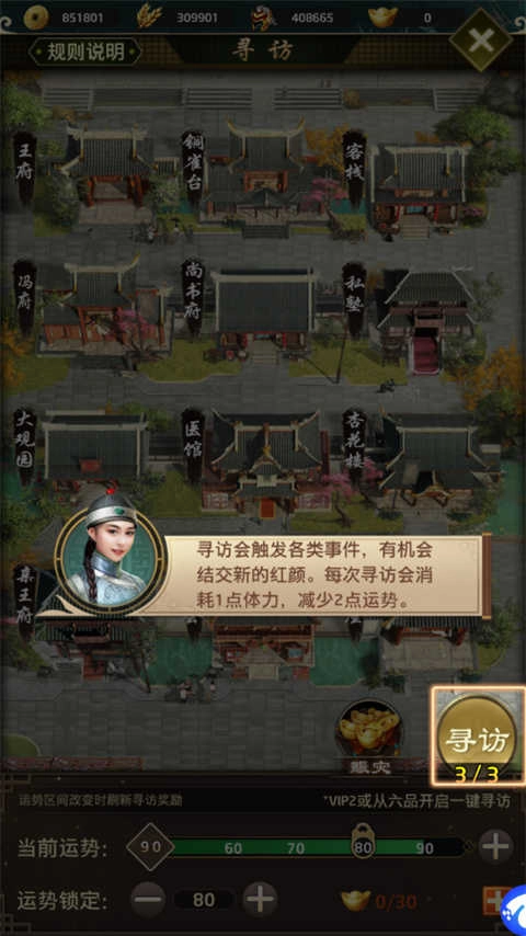 3、每次寻访时会触发不同的事件,玩家有机会结识新的红颜角色。每次操作将消耗1点体力并降低2点运势;