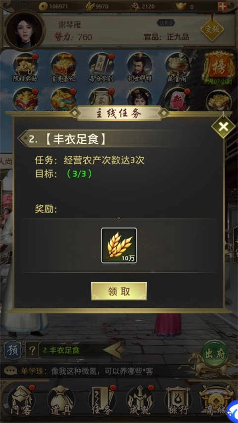 完成主线任务不仅能推进游戏进程,还能收获银两、粮草等丰厚资源奖励,为发展提供强大后盾。