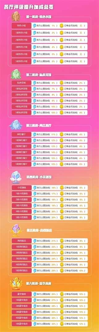 每当评级提升,各位店长的餐厅即可永久享受不同的等级加成,不同的餐厅等级加成如下~