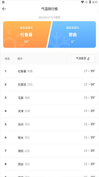 4、点击右侧的气温排名,就能清晰地看到全国各地区的温度排行情况。