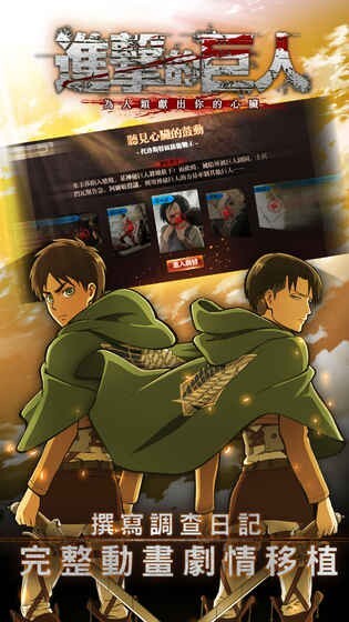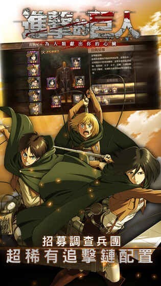 《进击的巨人》是一款改编自同名动漫的热血卡牌游戏。在游戏里,玩家能体验到丰富多样的精彩战斗模式;同时,游戏采用复古经典的动画风格,不仅完美还原了动漫中的各类角色与经典场景,还完整呈现了原作世界观,将引领玩家踏入这个既精彩又残酷的世界。
