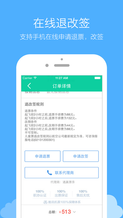 支持机票在线退票、改签,方便快捷,给你想改就改、想退就退的保障。