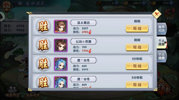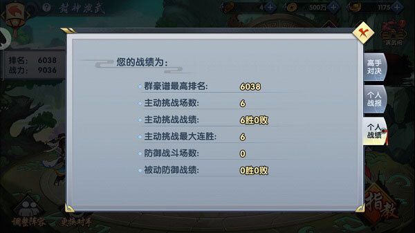 在封神演武界面,点击【战报】按钮,既能通过录像回放高手对决、个人战报里的精彩战斗画面,也能在个人战绩板块查看自己当前的挑战成果。