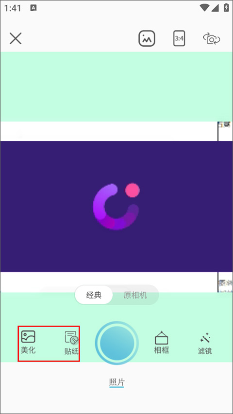 2、开启美颜相机,用户既能够使用经典模式或原相机模式进行拍照,也能够挑选美化、贴纸、相框等功能辅助拍照。