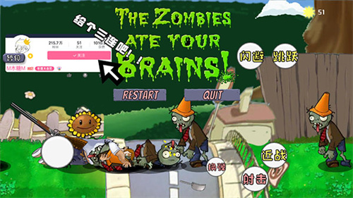 3、一旦僵尸靠近,戴夫的脑子就会被吃掉。从图中能够看出,戴夫目前拥有4个脑子作为生命值,每遭受一次攻击,就会消耗一个脑子。现在,开始射击战斗吧!