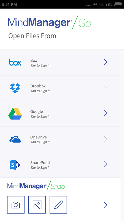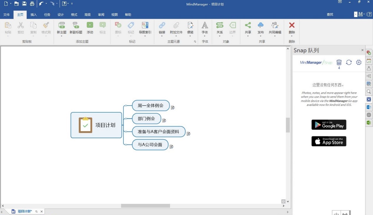 MindManager snap是MindManager Go里的一项新功能,借助该功能,用户能够用手机记录自己突然涌现的灵感,随后将其提交至MindManager云服务器。之后,用户只要在电脑上打开MindManager,就能获取这些记录的信息,并对其加以编辑,如此一来,用户可更方便地实现移动办公。具体操作方式如下: