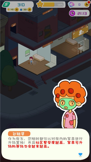 6、身为房东,您能够随时对房内家具进行升级更换。并且,社区的繁荣度越高,家具可升级的等级也就越高。一旦升级了家具,租客们会主动提高租金。在包租婆这儿,没人能占到便宜。在此处点击您想操作的房间,即可查看并升级家具。