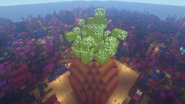 我们先完成菠萝主体部分的建造,依照地基结构,高度可按玩家喜好自行决定,往上建15格或者20格都行。接着逐步向里收拢,完成收拢后,就可以进行第三步——建造菠萝叶。
