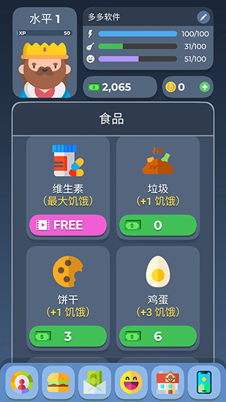 3、我们能够通过点击“食品”来提升饥饿值,点击“兴趣爱好”来提升心情值。然而,这些为我们所熟知的增加数值的操作,都需耗费不少钱财,且这些钱财均会从我们获取的财富里扣除。