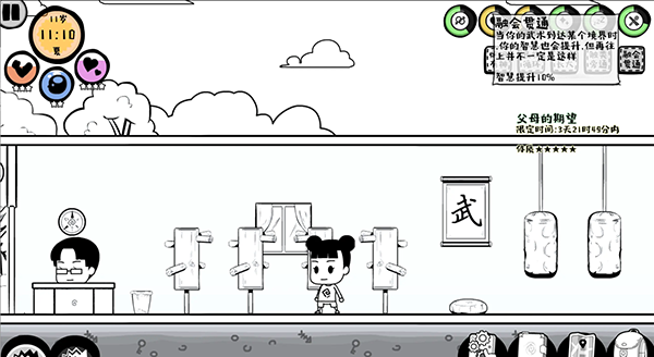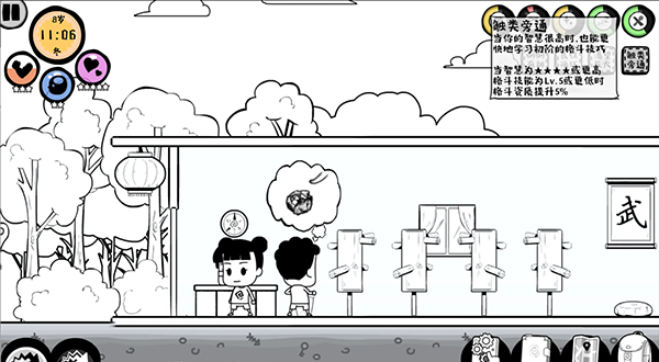 - 第四个buff为(良性循环),当拥有资金且前往武馆,若资质未达满星,必定触发该buff。毕竟技能尚未学习。其作用是使格斗资质提升5% 。