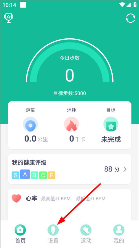 1. 开启fitpro手环app,登录后进入首页,在首页能够查看每日运动步数、心率以及健康等级等信息,接着点击设置。