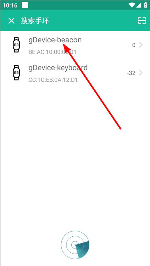 3、进入手环搜索页面,软件会自动搜索并识别手环,点击识别到的手环进行连接与绑定。