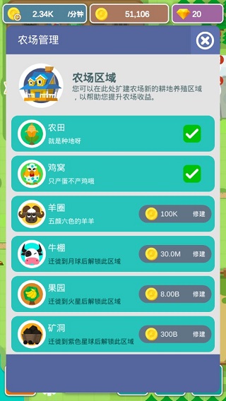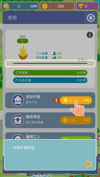要是觉得赚钱的速度不够快,那么能够通过对这块区域进行升级,从而种植更多的作物。点击小屋,长按升级按钮,就能持续开展升级操作。升级之后的区域会给你的农田带来更为丰厚的金币奖励。