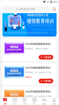 1、下载并进入河南专技在线手机app,首页有大量教育培训课程供您学习。您可按培训课程类型选择报名学习。