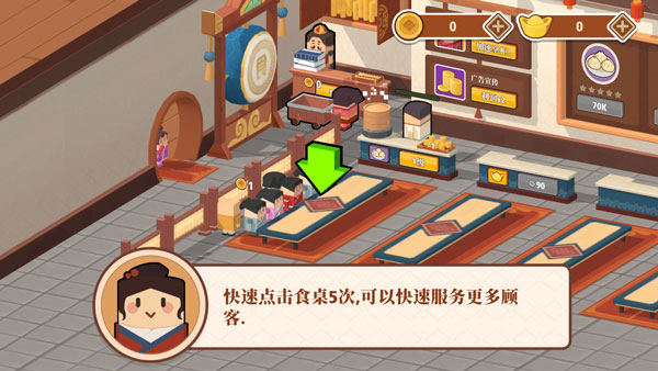 2、快速点击食桌5次,可以快速服务更多顾客。