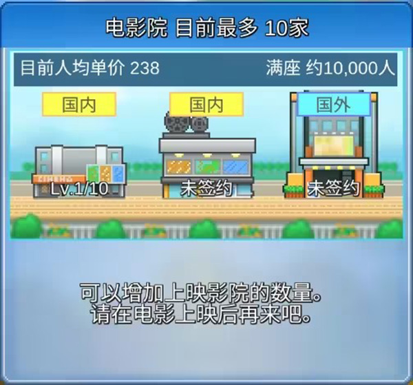 签约的影院线数量越多,电影院的档次就越高,相应的票房收入也会越高。在此建议,优先考虑与国内的电影院进行签约并推动其升级;其次,可选择自建影院;最后才考虑国外的电影院。这是因为每次在国外发片都需要额外支付一大笔手续费,尽管为了获取票房这笔费用不能节省,但在花钱的时候还是必须要谨慎。无论在任何时候,都务必预留足够的资金用于下一部电影的制作,毕竟拍出一部好电影才是整个游戏的核心宗旨。