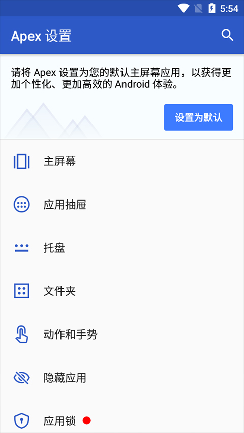 Apex Launcher桌面启动器,堪称安卓启动器应用中的佼佼者。其强大的个性化定制能力,深受众多安卓用户青睐,能让你的安卓手机变得更高效且美观。或许你知晓Nova桌面启动器,但你可能不了解,Apex Launcher同样声名远扬,与Nova不相上下。相较于手机自带桌面以及其他桌面,Apex Launcher桌面的优势显著,它可定制程度高、极度精简且,运行流畅,占用资源少。而且它功能极为丰富,涵盖隐藏应用、应用锁设置、动作和手势、Apex设置等。无论你是钟情于手势操作,还是追求动画效果,Apex Launcher都能给予你最大限度的支持。感兴趣的朋友,赶快下载体验吧!