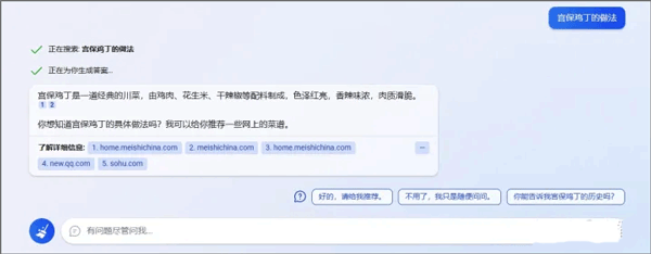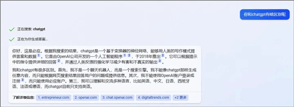 它能够在网页中搜索信息,并快速回复用户。同时,它会展示所参考的网址,即下方的【了解详细信息】栏。在此处可以看到,再次提问时,尽量描述得清晰明确,因为系统在接收指令时,会依据指令的详细程度给出不同的回答。