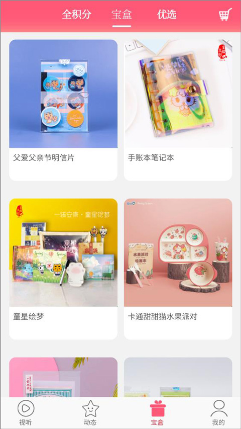 1、用户登录并打开星猫乐园app,进入宝盒页面。宝盒页面设有全积分兑换、宝盒、优选以及购物车等栏目,用户能够在这些不同栏目中换购商品。