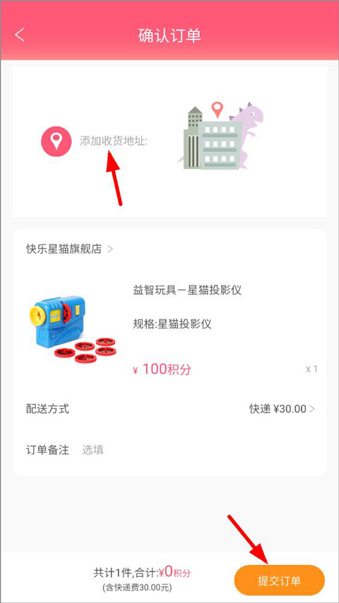 3、进入订单页面,用户需要添加收货地址,提交订单并支付对应积分即可。