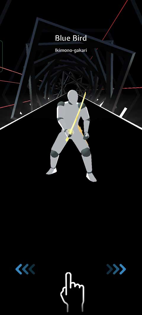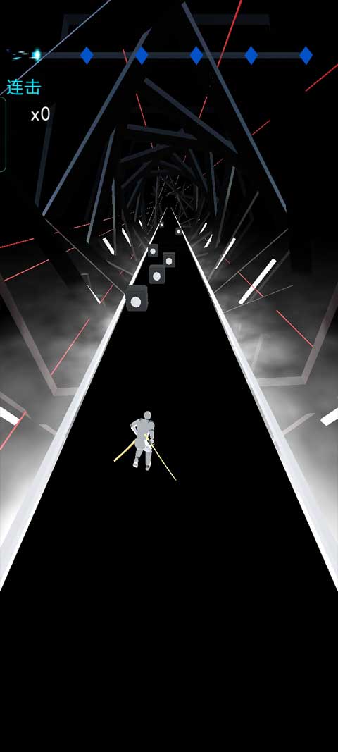 4、玩家依据方块的位置进行滑动,当滑至指定位置,角色便会自动开启劈砍动作,且在劈砍过程中,颜色会跟随音乐的节奏产生变化。