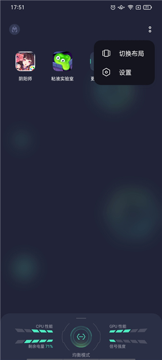 5、点击右上角,我们能够切换软件布局并进行设置。在下方,还会为我们展示游戏的CPU性能、GPU性能、信号强度等详细信息。