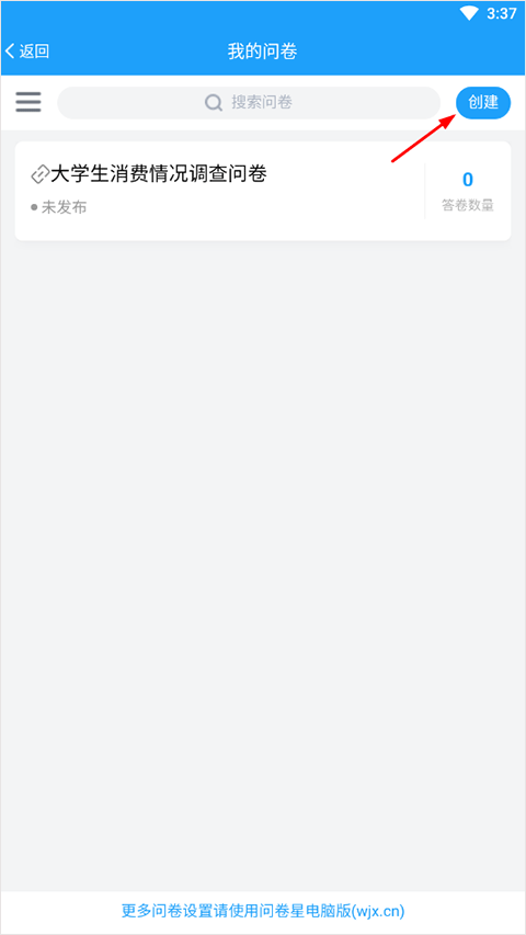 1、首先打开问卷星免费版,点击右上方创建按钮;