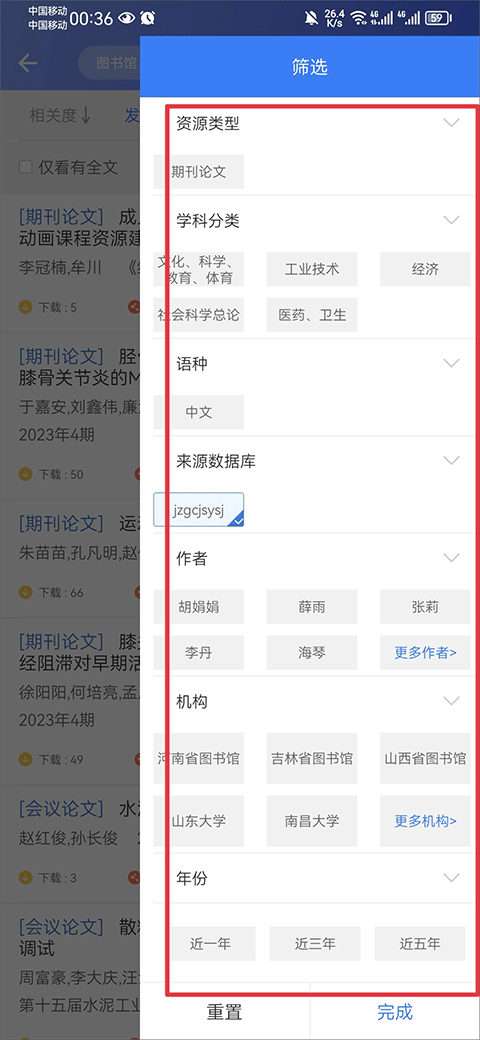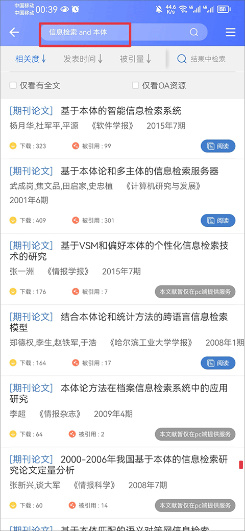 想必大家对软件首页的一框式检索都颇为熟悉,它能够达成海量多渠道且多种类资源的一站式检索与发现。在检索框左侧,能够选择资源类型,从而实现分类型检索。直接在检索框内输入检索式就能进行检索,操作极为便捷。比如,直接输入检索词“图书馆”,便能一键获取与“图书馆”相关的文献。此检索还支持跨语言检索。举例来说,在检索框内输入检索式“(information)”,检索出的结果涵盖中文、英文、日文、朝鲜文、德文、法文等多个语种,并且会实现混合排序。在结果页面选择所需的语种,就能够筛选出对应的文献资源。