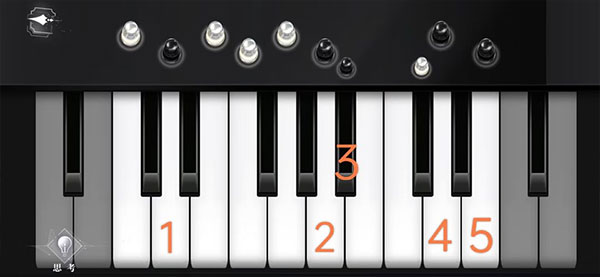 在钢琴处进行观察并弹奏,当进入钢琴界面后,首先点击思考,从而得出位置与颜色,随后仅弹奏与白色棋子相对应的琴键,具体可参照下图:
