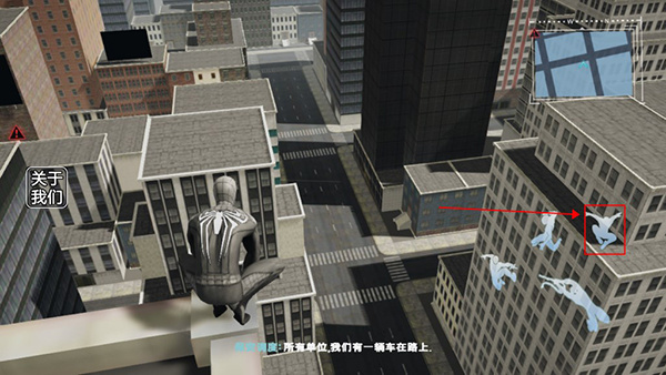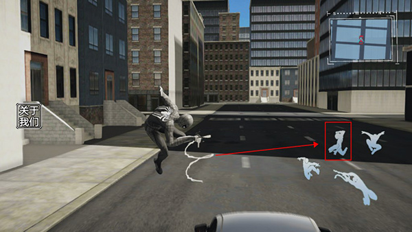4、玩家紧跟车辆后,可点击蛛丝发射按钮发射蛛丝,操控蜘蛛侠跳跃至车上。