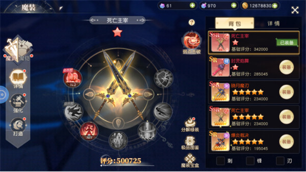 魔装宝盒里可获取大量的魔装,魔装等级分为N、R NR、SSR。通过对消耗低品魔装可打造为高等级的魔装。
