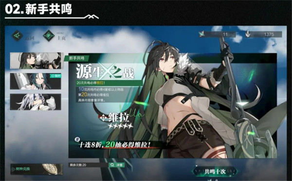 2、新手共鸣·源生之战,进行20次共鸣就必定能获得5星角色维拉[源能]。维拉运用散射型武装,搭配序曲技能—雾散回归,在中近距离范围内能够迅速造成高额伤害。