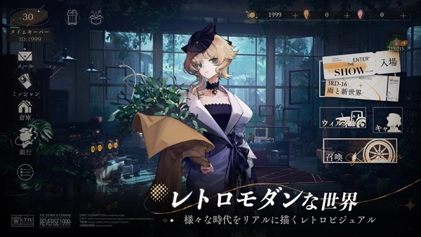 《重返未来:1999》日服是一款具有二次元近代复古风格的策略游戏,英文名称为Reverse 1999,日文名为リバース:1999 。该游戏的背景设定于1999年的最后一天,彼时天空降下一场“风暴”,雨水致使路人与建筑物的墙壁融化剥落,世界就此迈入新的旧时代。