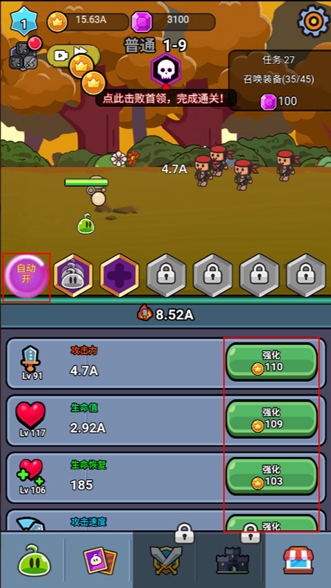 3、用金币强化属性,点击“自动”可以自动挂机攻击;