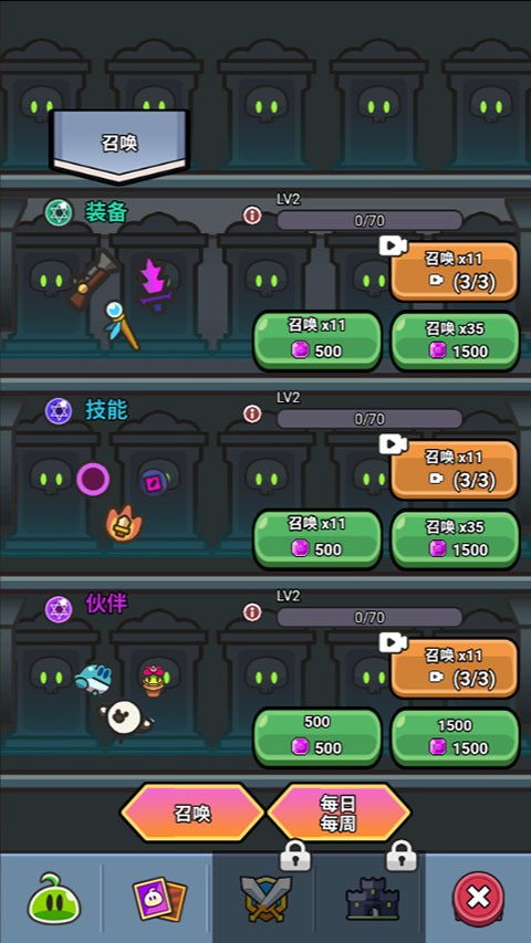 4、召唤可以召唤多种装备、技能以及伙伴;