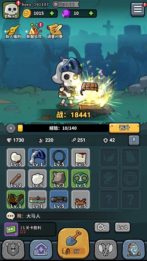 倘若没有梦想,那与咸鱼又有何差异?想必众多玩家对这句台词都耳熟能详。没错,要是缺失梦想,便宛如行尸走肉。本期小编要给大家推荐一款小小骨头人游戏,这是一款放置类的开箱养成手游。谁能料到,小小的骨头人竟怀揣着大大的理想,它立志成为最强大的骷髅王。在主界面通过铲子不断挖坟,就能获取各类装备,装备品质随机生成,你可依据提升的数值,来决定是否装备或是出售。