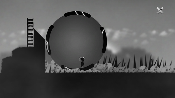 ②将大球继续向左推,推至斜坡使球能因重力向下滚动。这时我们操纵小女孩向右逃跑