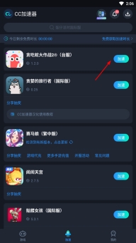 1、若要在本站下载《贪吃蛇大作战2》官方版,游戏启动需要借助加速器。具体操作是,先打开CC加速器,在其中找到该游戏,接着点击游戏右侧的加速按钮。