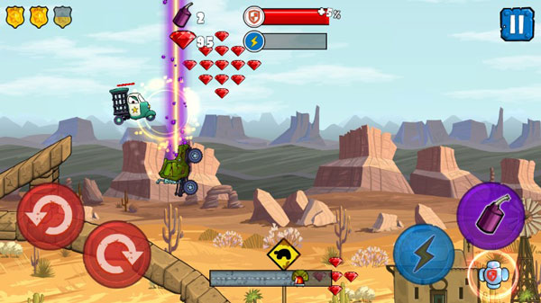 7、在闯关的图中,我们需要使用炸弹炸毁途中的车辆,获得燃油和钻石奖励,