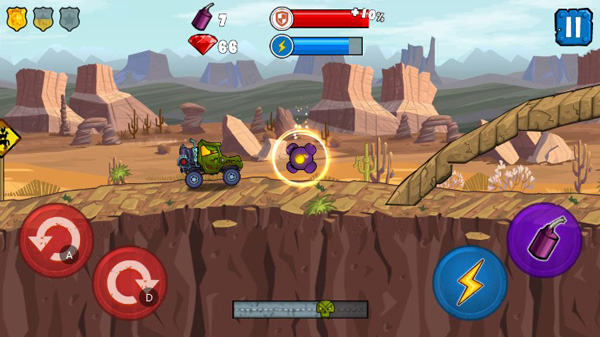 就游戏玩法而言,整体较为简单。左侧主要用于控制赛车重心,右侧则以加速和释放炸弹为主。同时,关卡中设置了大量的障碍和独特的道路设计,使得每一关都独具特色。